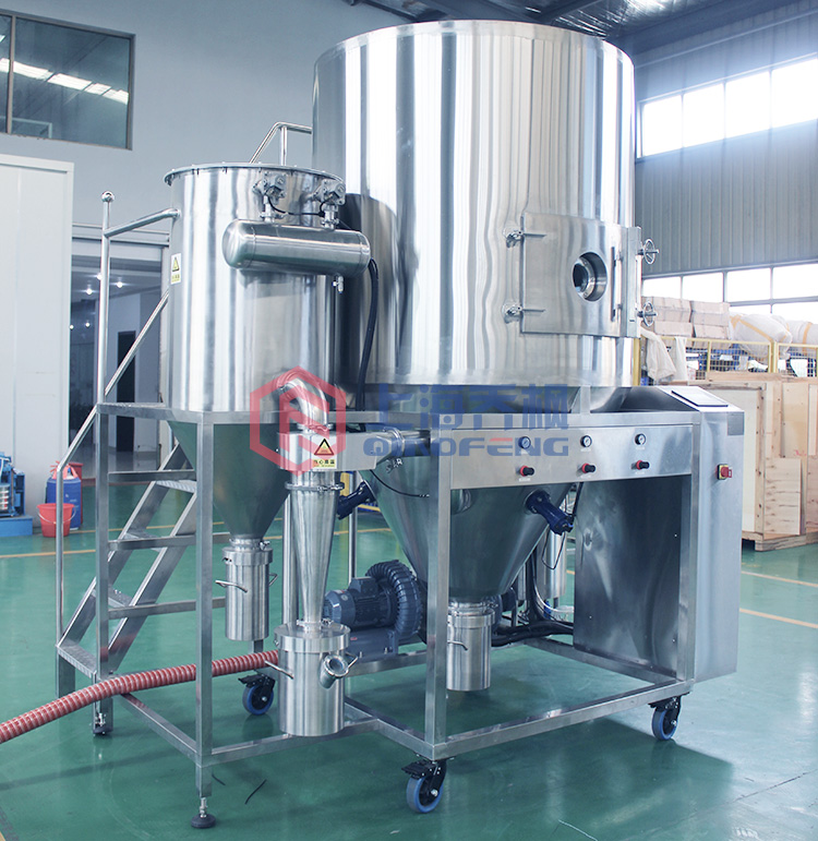 操作原理是空氣通過過濾器和加熱器,進入干燥塔頂部的空氣分配器,然后均勻地進入干燥室的螺旋形狀。 液體通過過濾器從液體罐泵送到干燥塔頂部的離心霧化器,使液體噴入極小的霧滴,液體液體與熱空氣平行接觸, 水迅速蒸發(fā)。 在短時間內(nèi)干燥成品。 成品從干燥塔底部和旋風(fēng)分離器排出,廢氣通過風(fēng)扇排出。